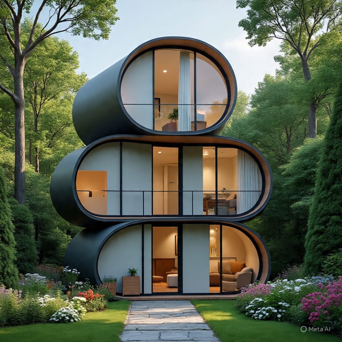In a quiet neighborhood, nestled between bustling streets, stood a unique duplex capsule home. The exterior was sleek and modern, with a façade of interlocking modules in soothing shades of gray and green.